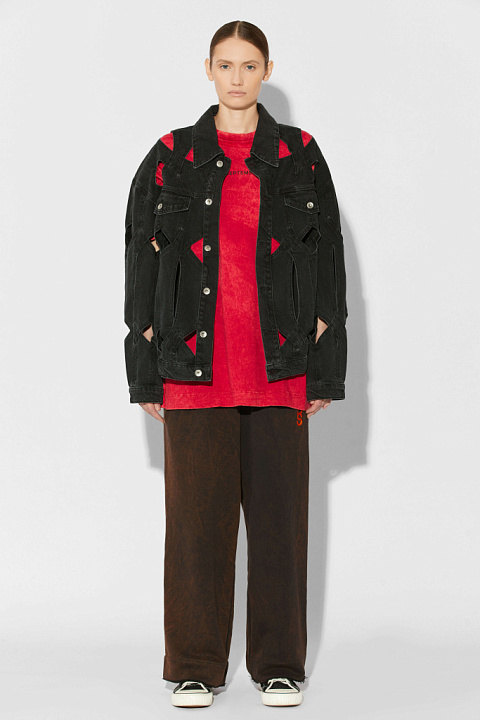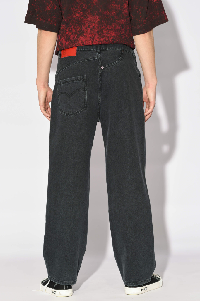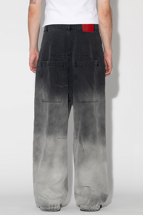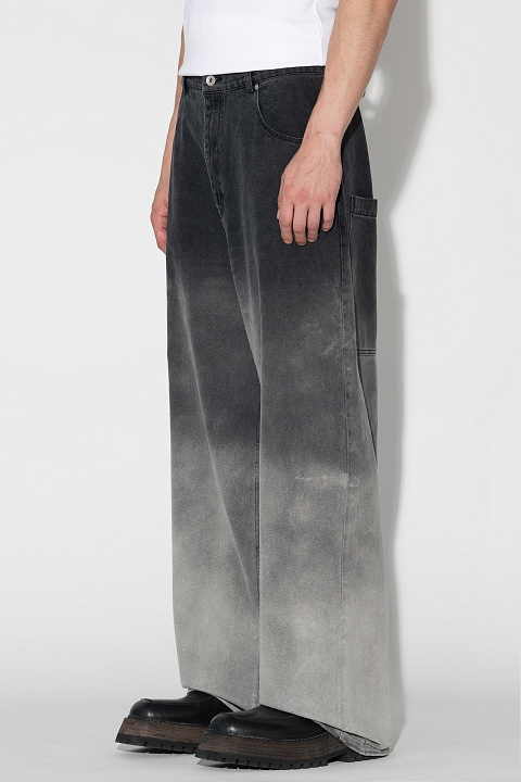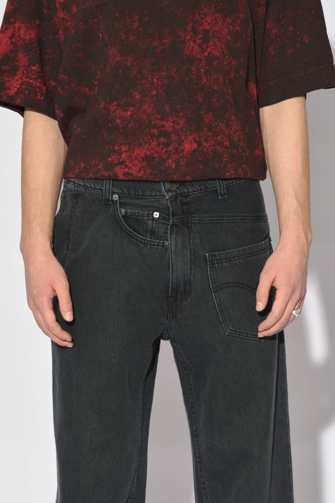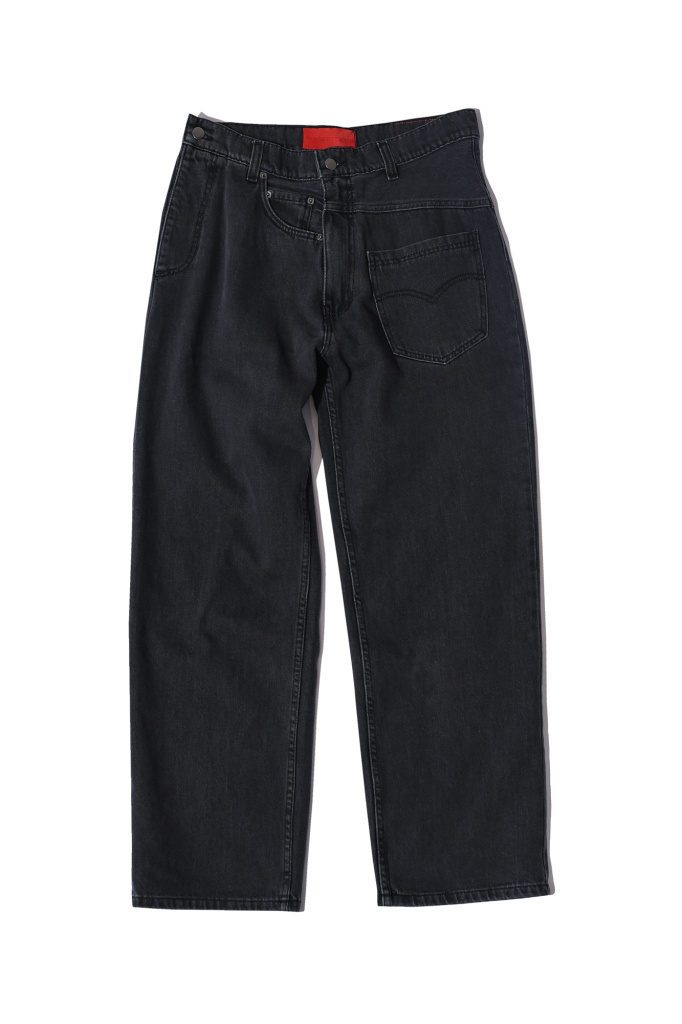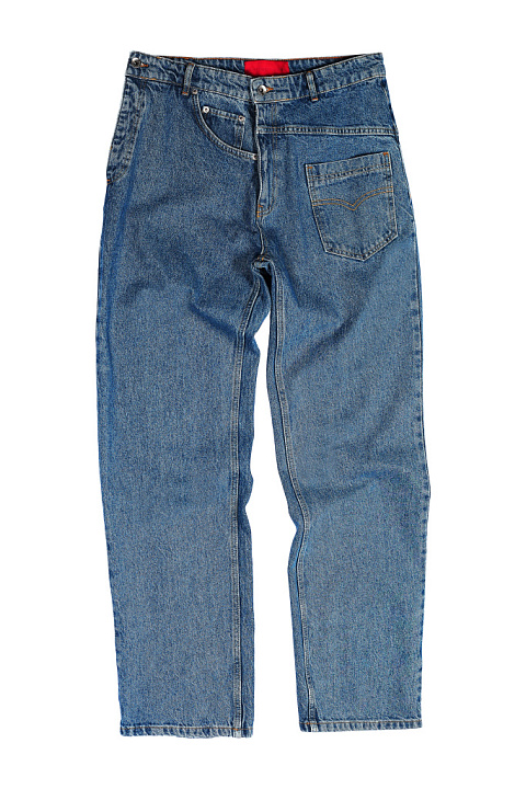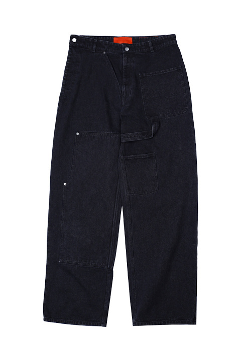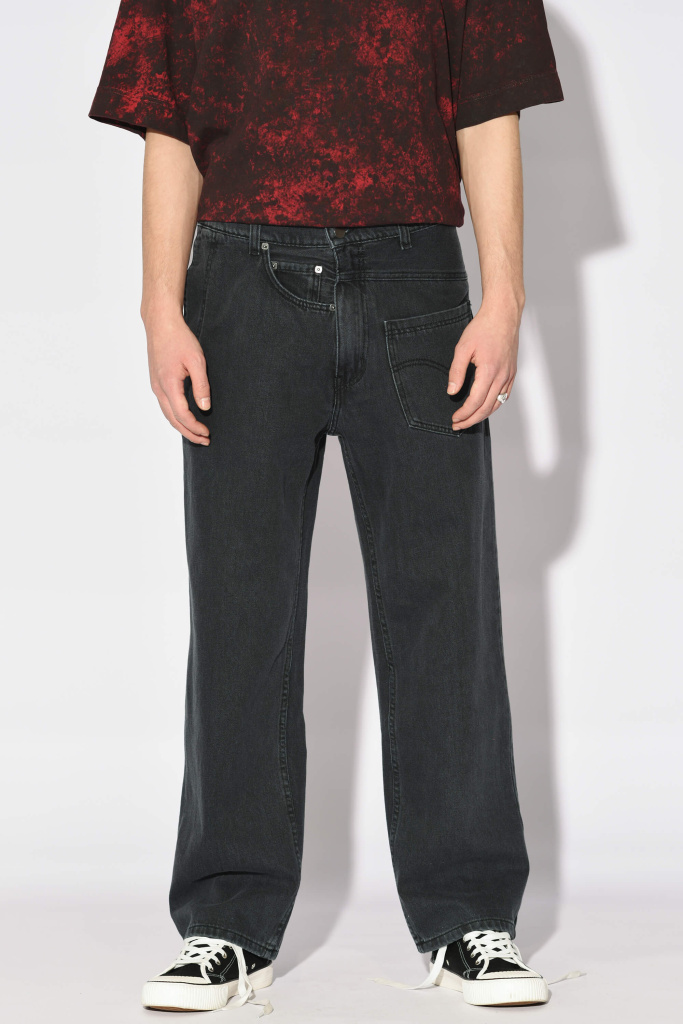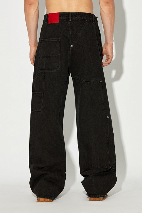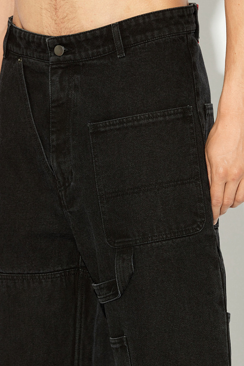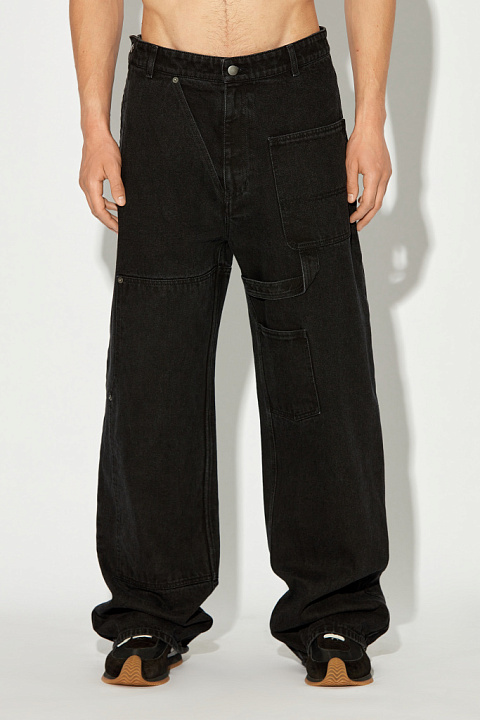 Черные мужские джинсы прямого кроя имеют знаковый элемент дизайна Red September — сложный крой с ассиметричным расположением карманов, будто джинсы перевернуты.