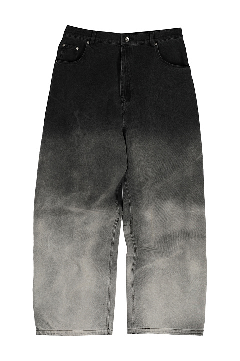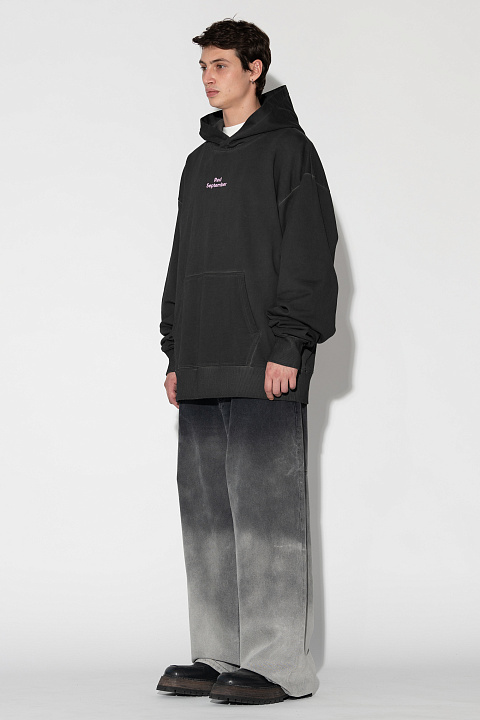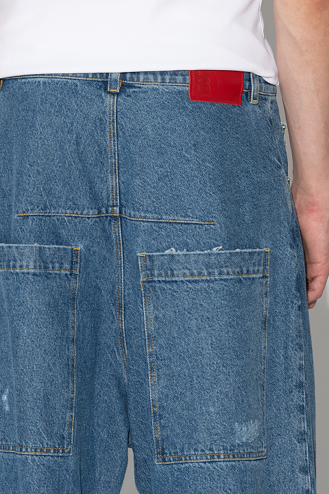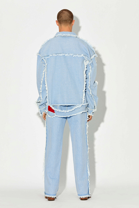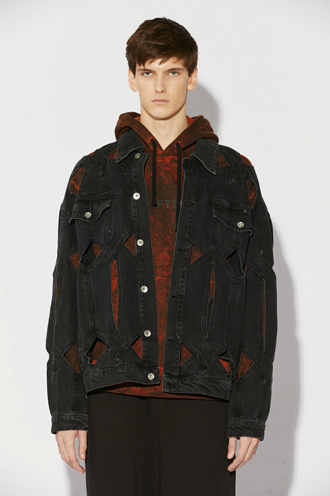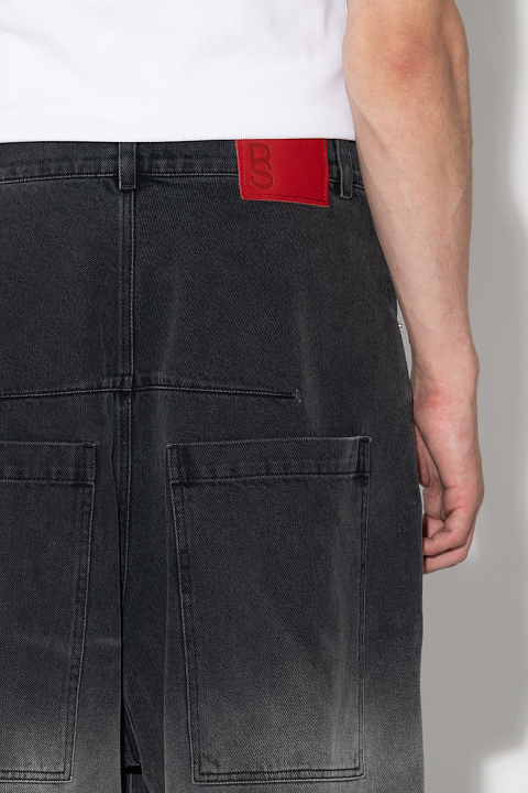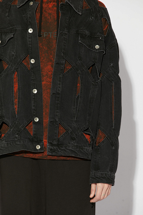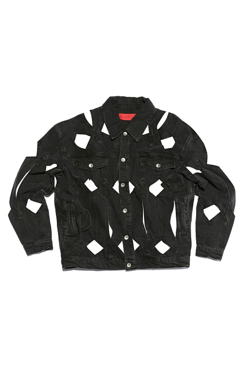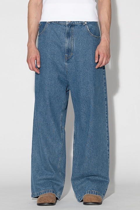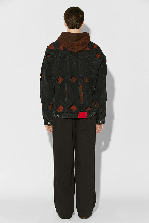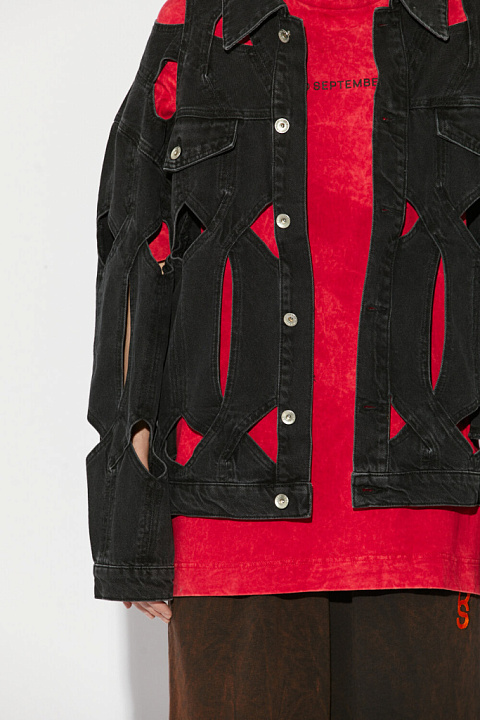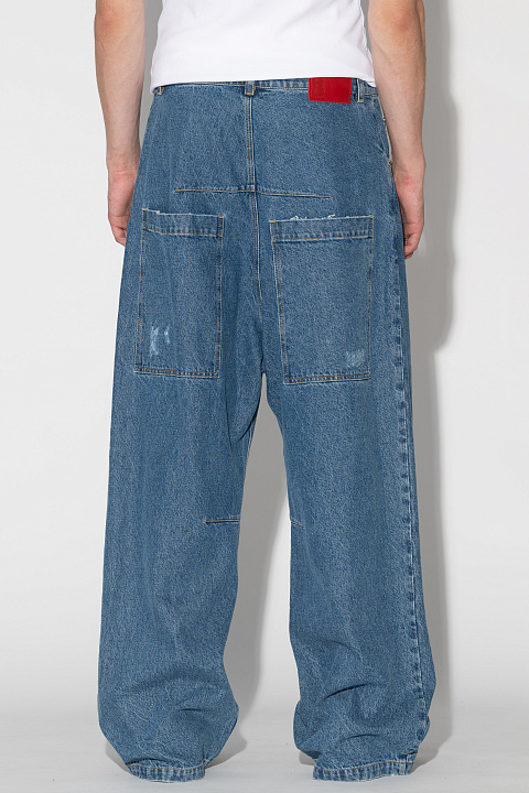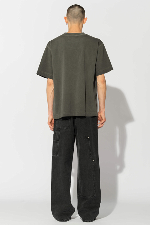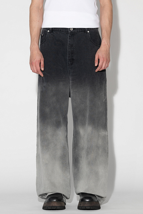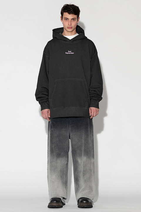 Черные мужские джинсы прямого кроя имеют знаковый элемент дизайна Red September — сложный крой с ассиметричным расположением карманов, будто джинсы перевернуты.