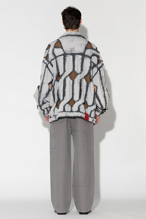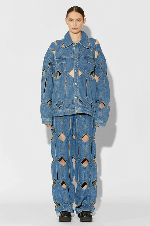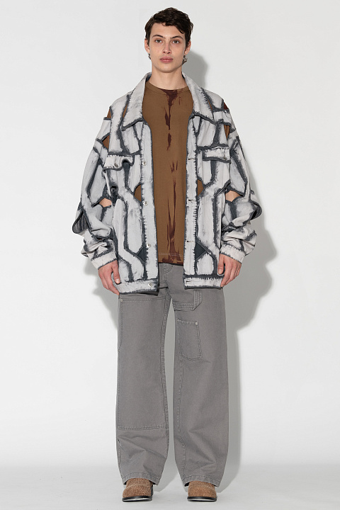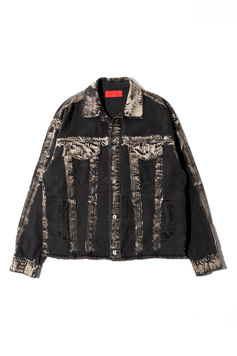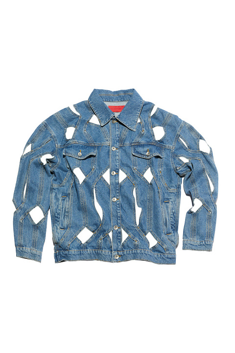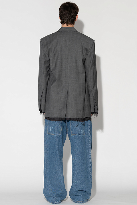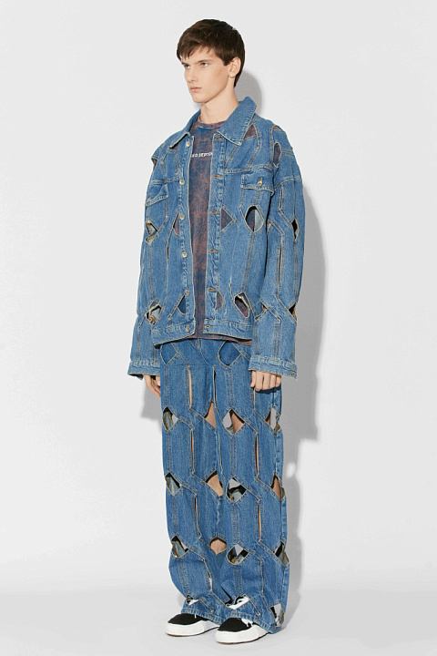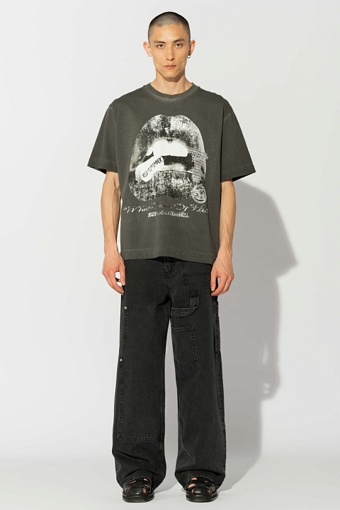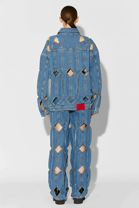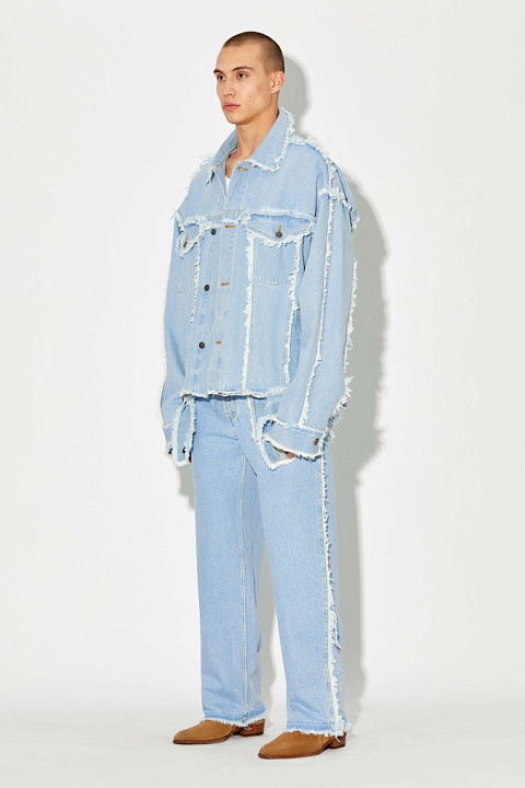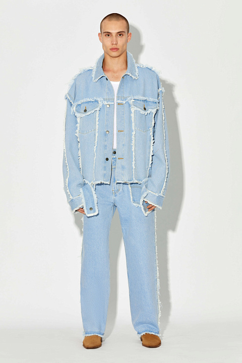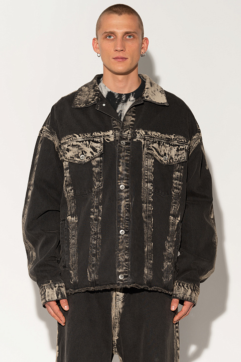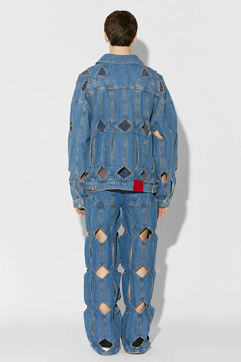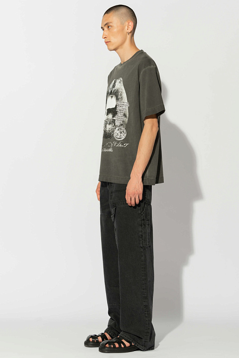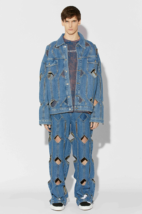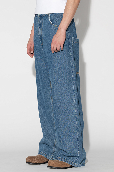 Черные мужские джинсы прямого кроя имеют знаковый элемент дизайна Red September — сложный крой с ассиметричным расположением карманов, будто джинсы перевернуты.