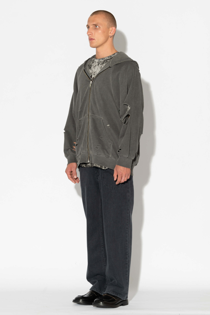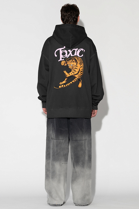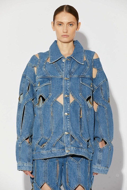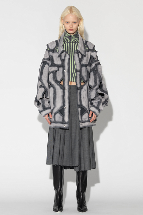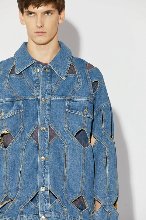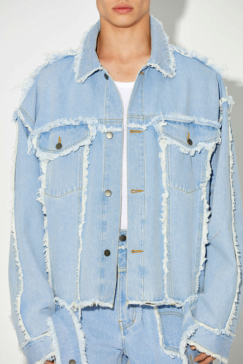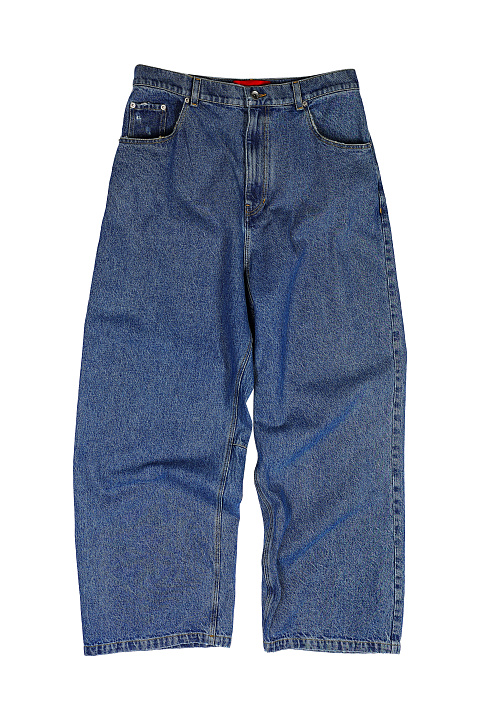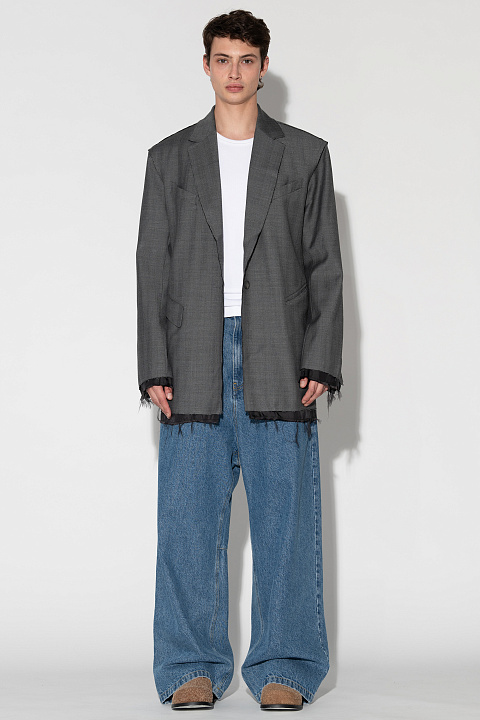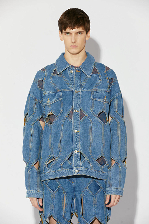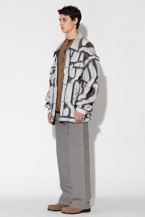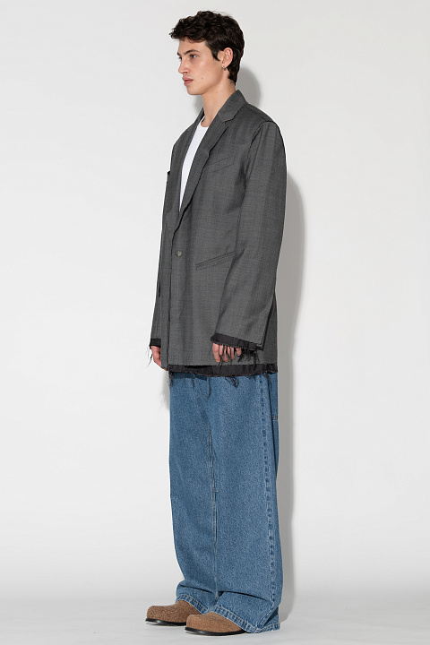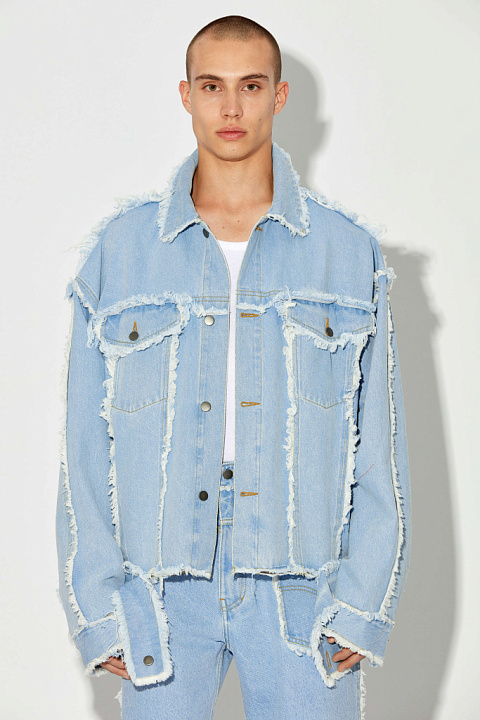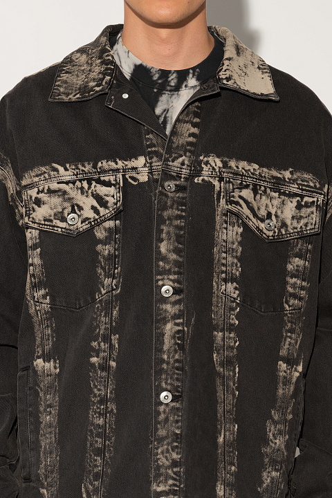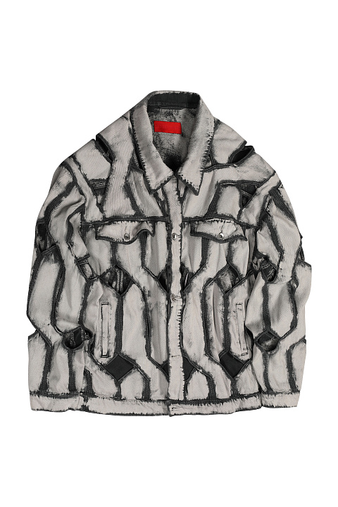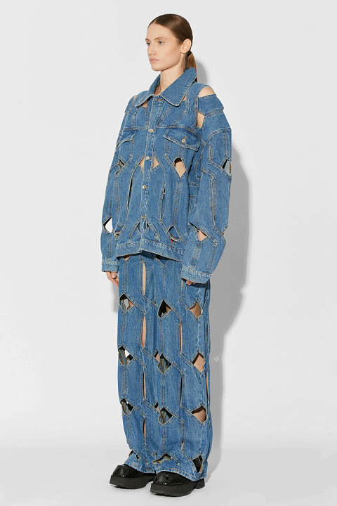 Черные мужские джинсы прямого кроя имеют знаковый элемент дизайна Red September — сложный крой с ассиметричным расположением карманов, будто джинсы перевернуты.