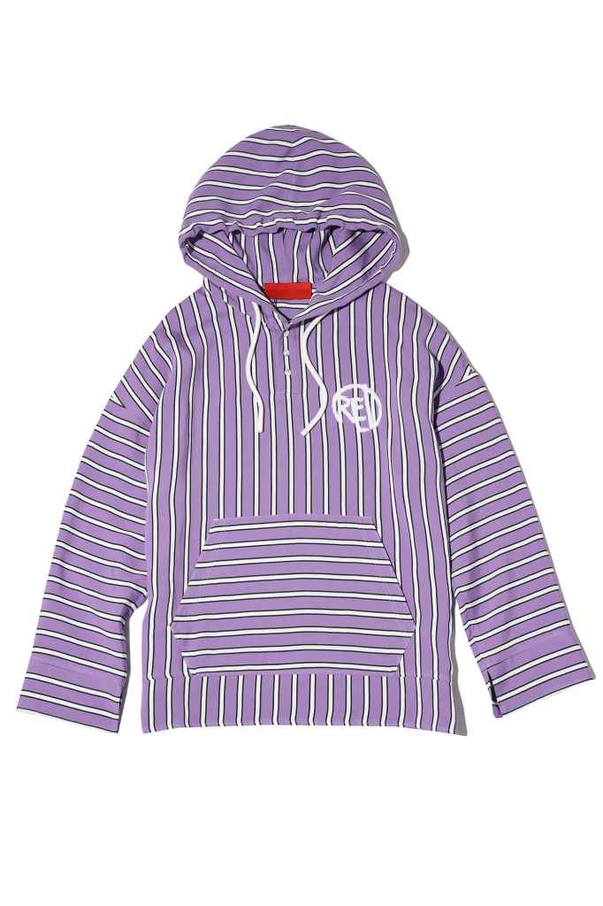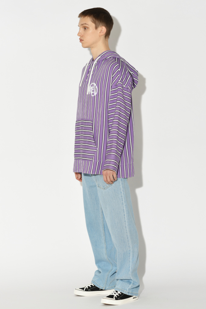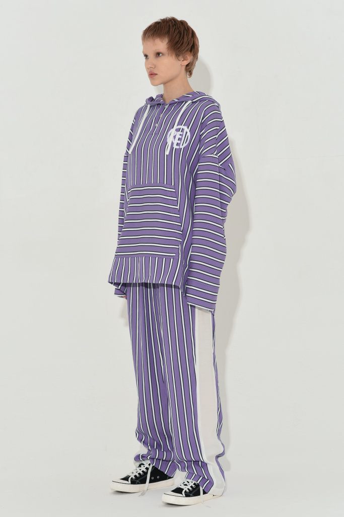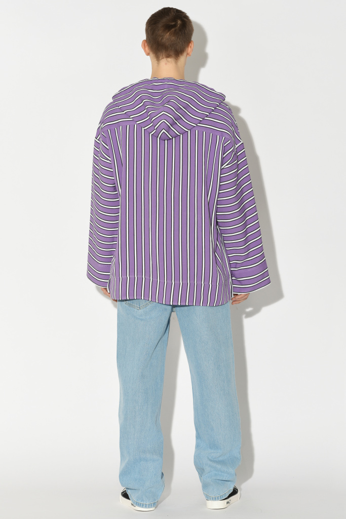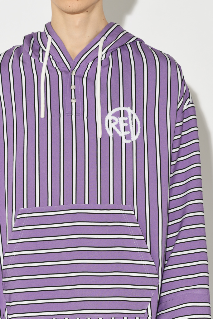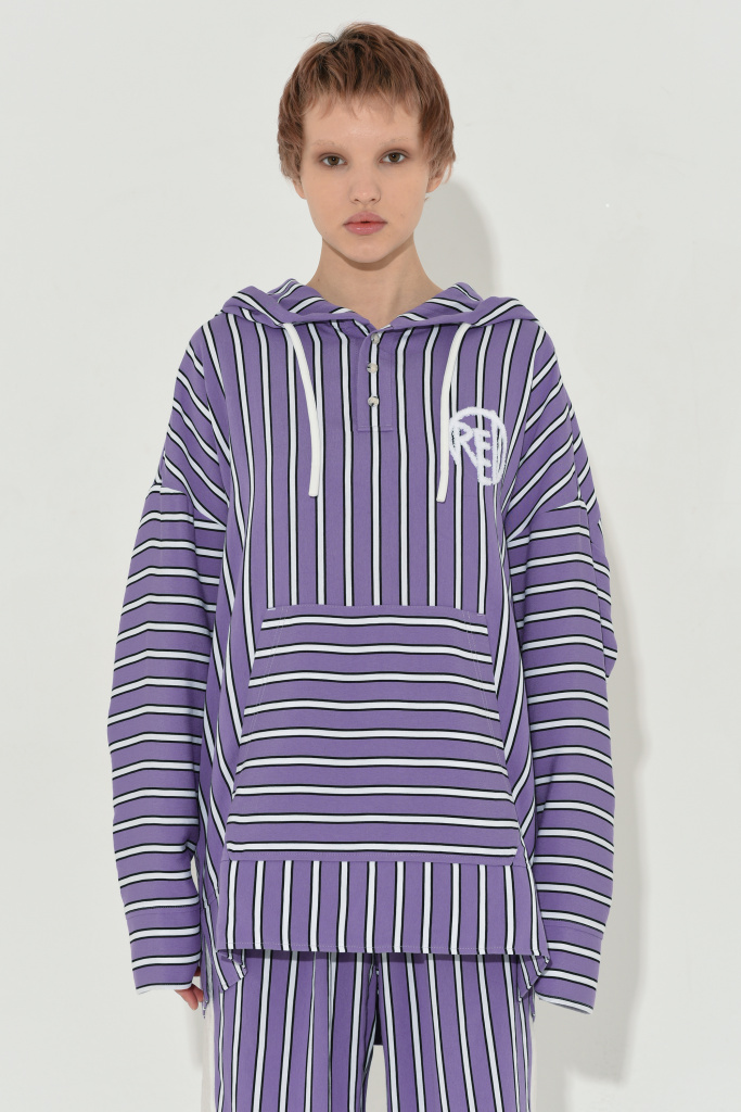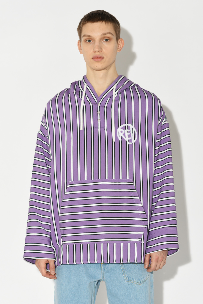Фиолетовое худи из мягкой вискозы в полоску свободного кроя. Дополнено застежкой на пуговицы и вышивкой логотипа Red September.