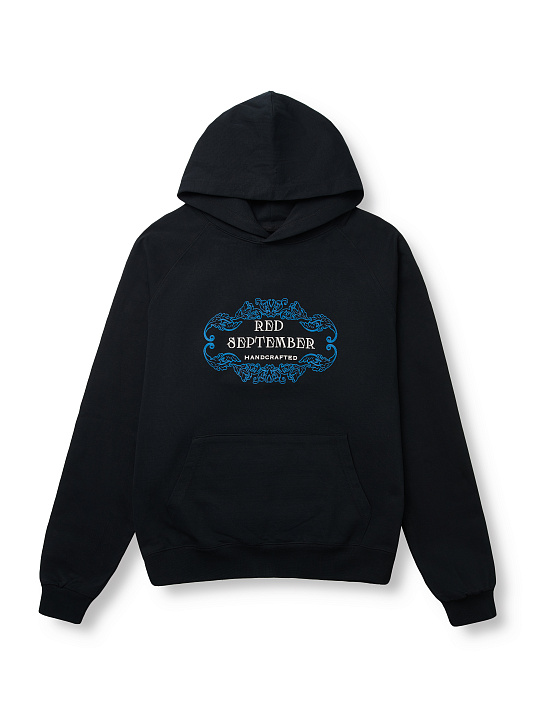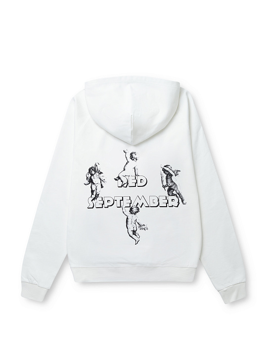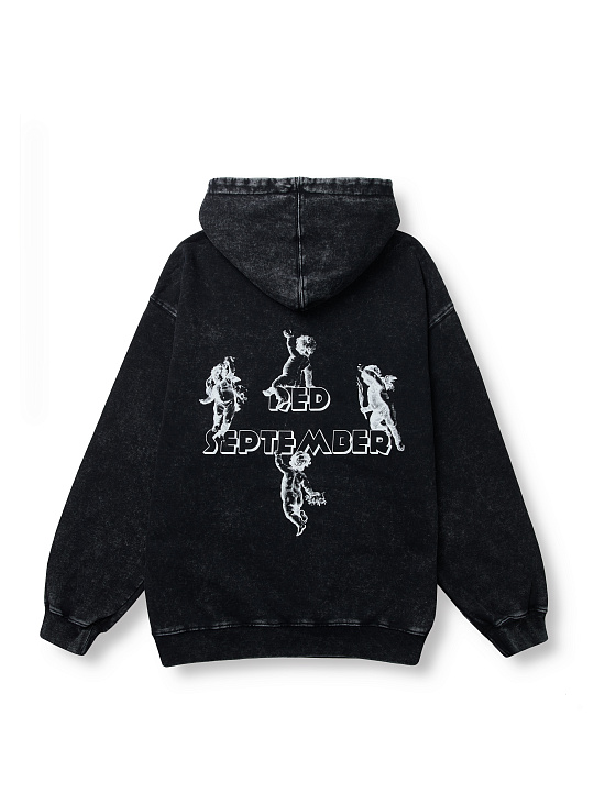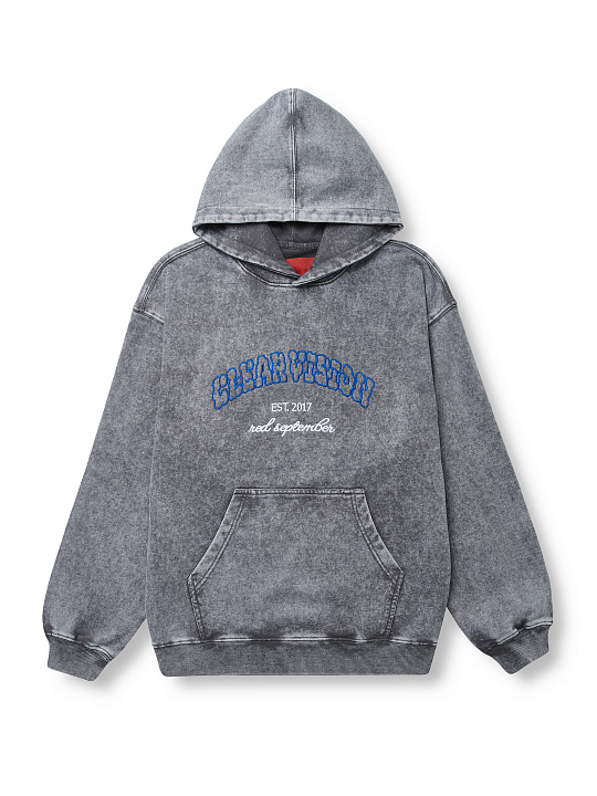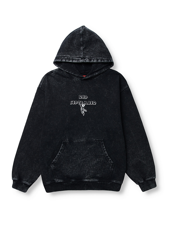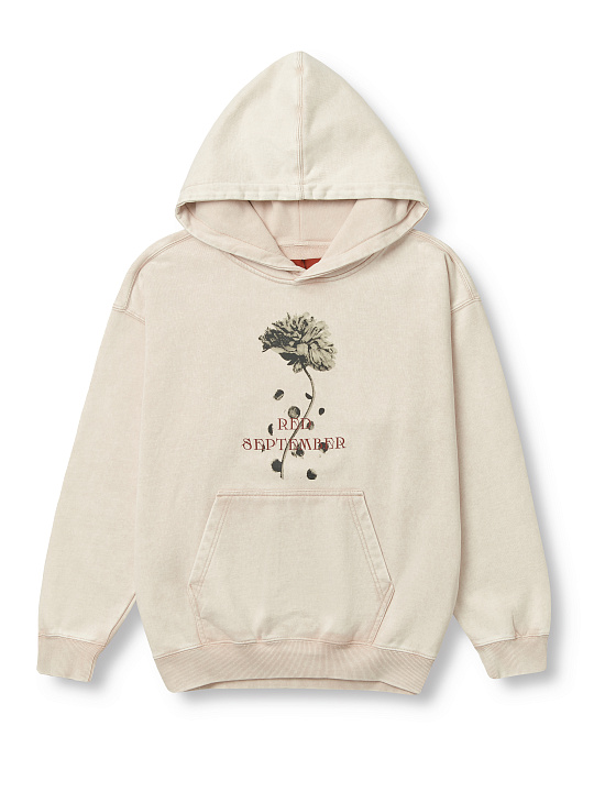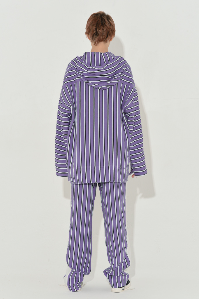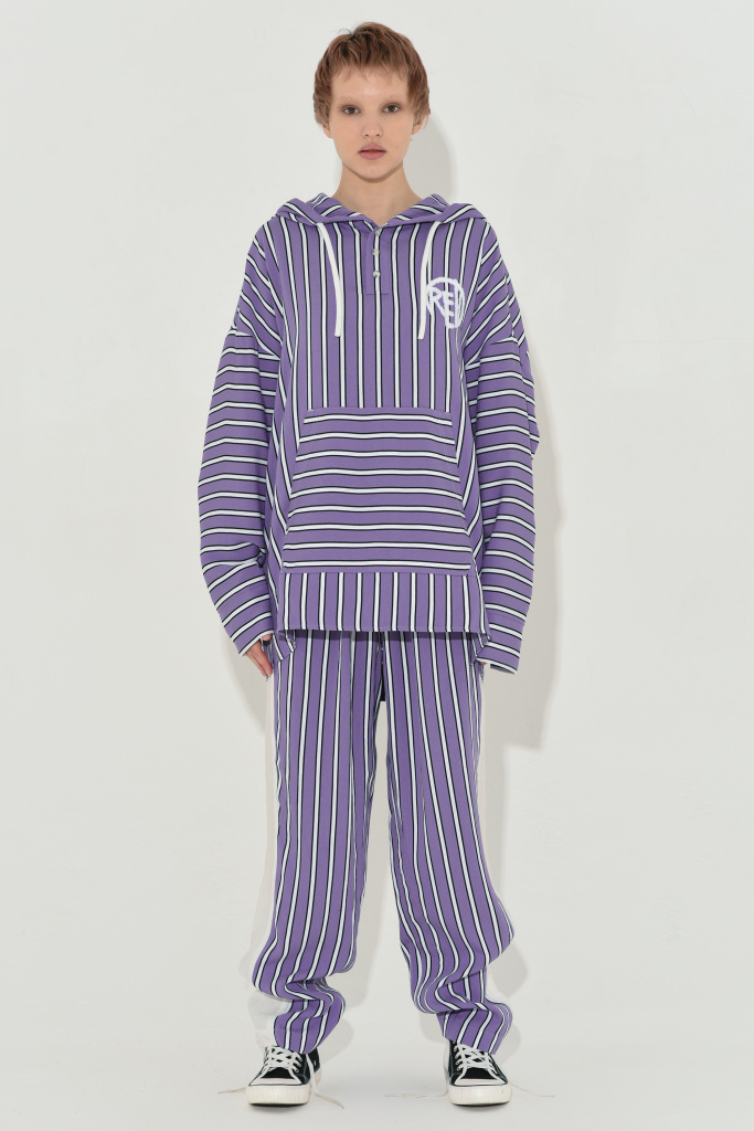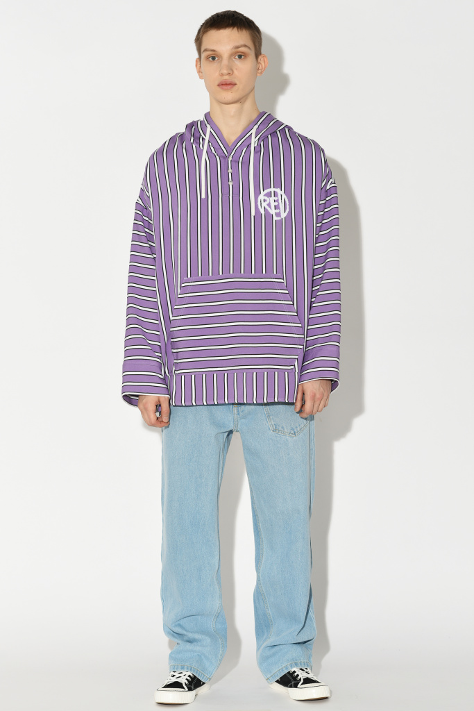 Фиолетовое худи из мягкой вискозы в полоску свободного кроя. Дополнено застежкой на пуговицы и вышивкой логотипа Red September.