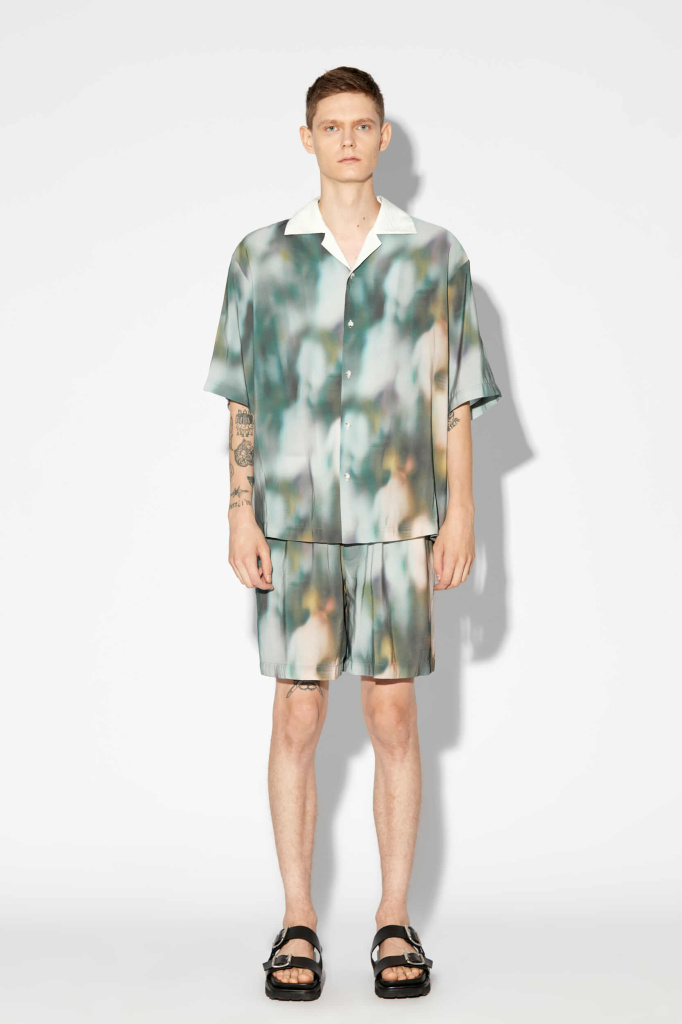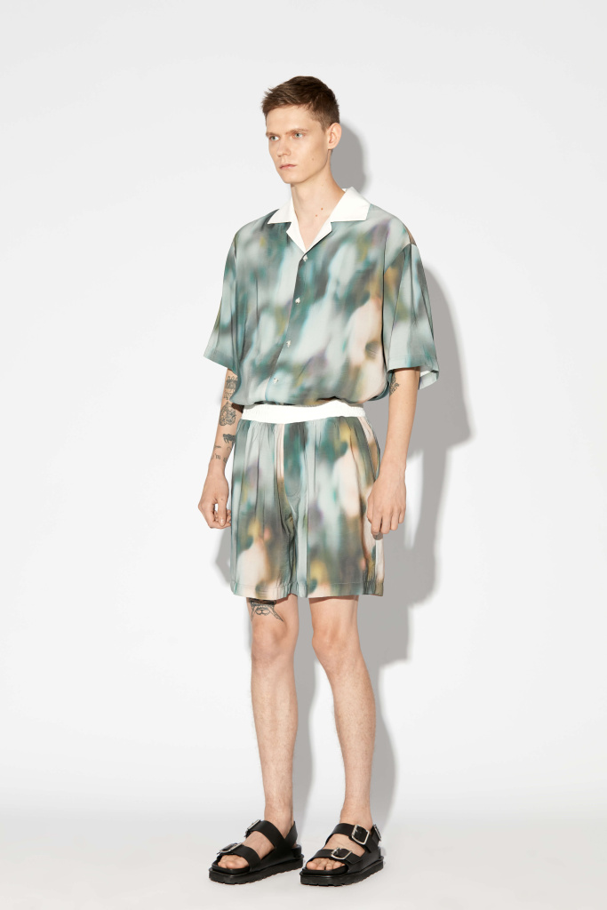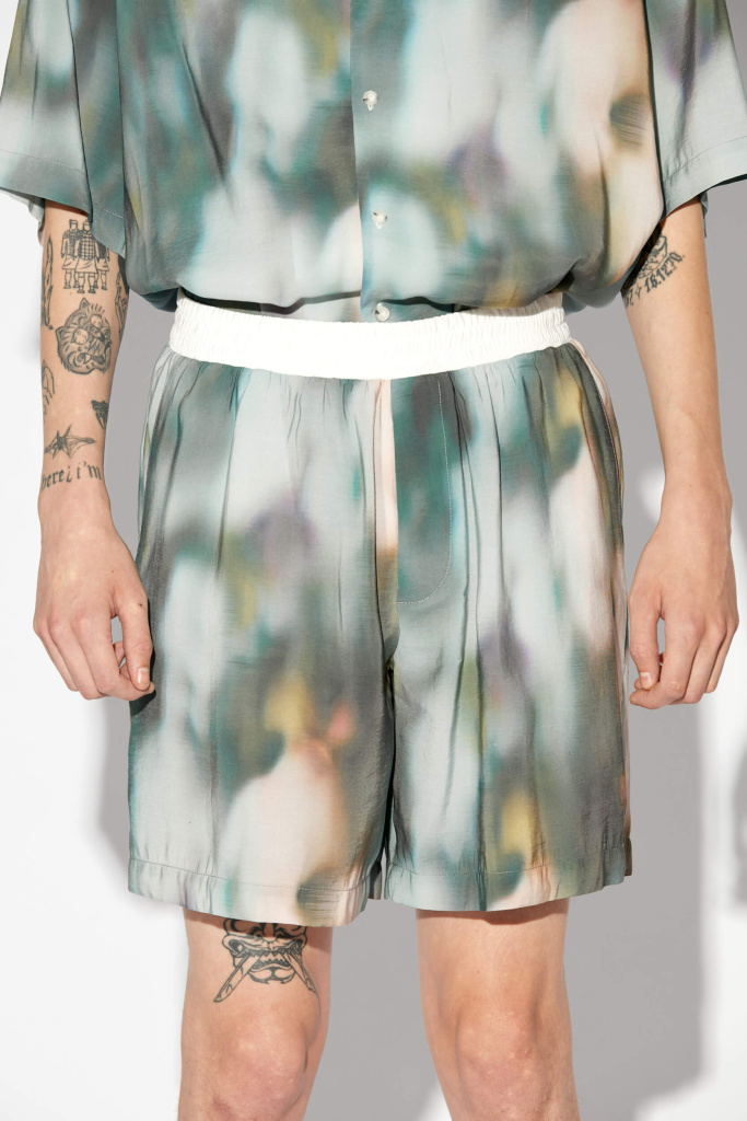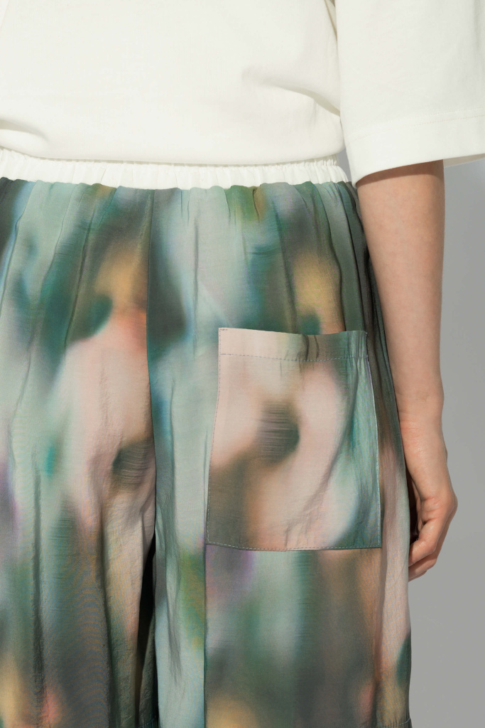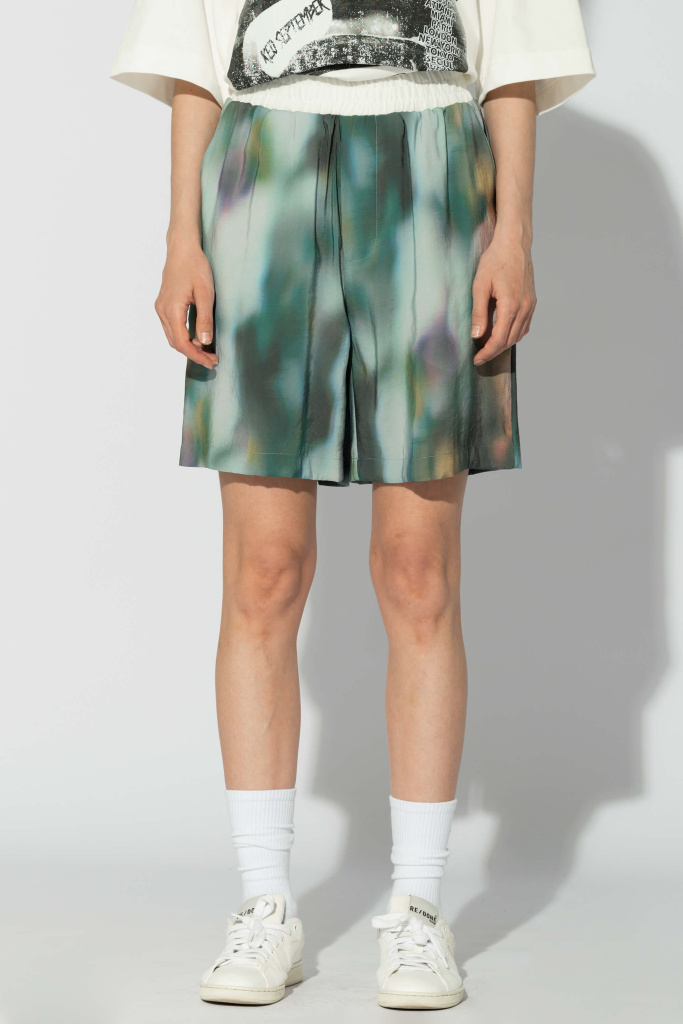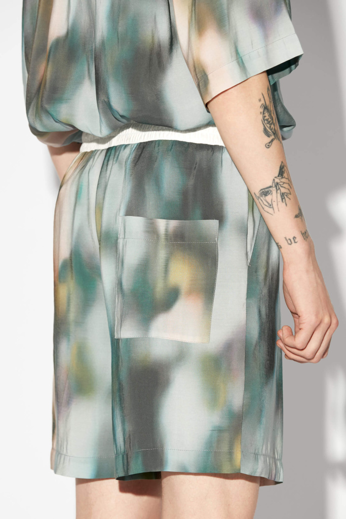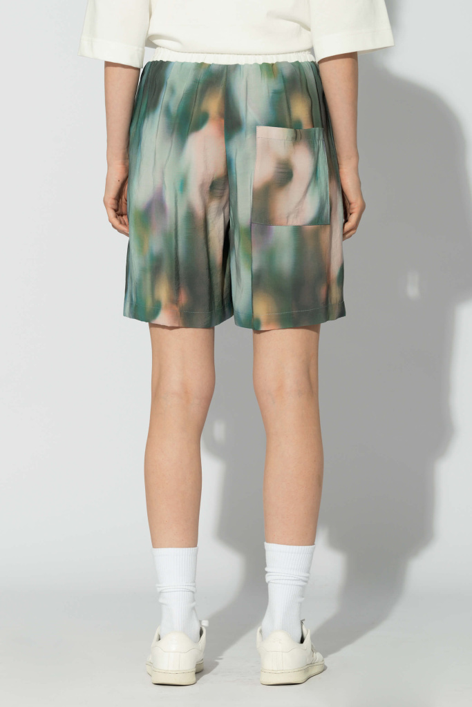 Шорты из модала с сезонным принтом. Свободная посадка Контрастный пояс на резинке Боковые карманы Задний накладной карман Авторский принт нанесен путем примой печати